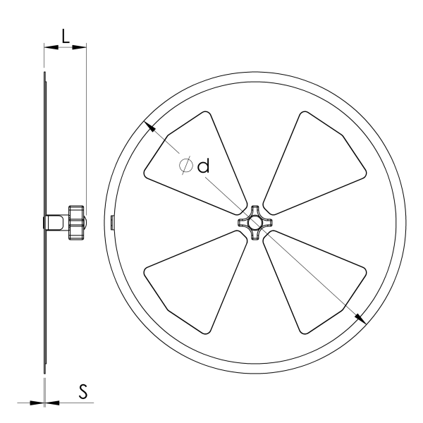 The adjutable blanking plates are attached to the end of a ducting system or on a branch to manually regulate the airflow for use in overpressure, under-pressure and pressureless systems.It is locked in the desired position by tightening the star knob.It is held in place by a ring (sold separately).
