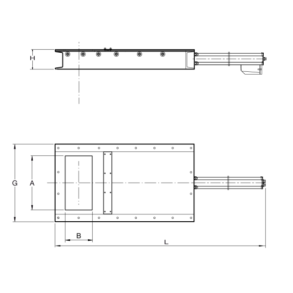 Full welded pneumatic Redler outlet gates to discharge material from a cyclone, a silo, or such. The gate blade is mounted on roller bearings and the base frame is 5 mm thick. Without transition.