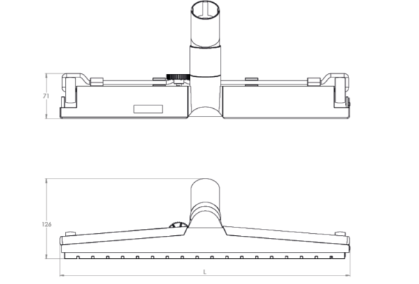 Floor nozzle with brush strips and wheels. Connects onto chromate suction pipes CZZK, CZZL or CZZM.