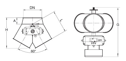 Full welded round pneumatic trouser diverter with interior collar for bulk transport to silos, containers and such. The change in direction of the material is operated by a pneumatic rotating actuator connected to a bistable 5/2 solenoid valve, 24V DC with limit switches. The inner plate is mounted on two ball bearings for smooth running.