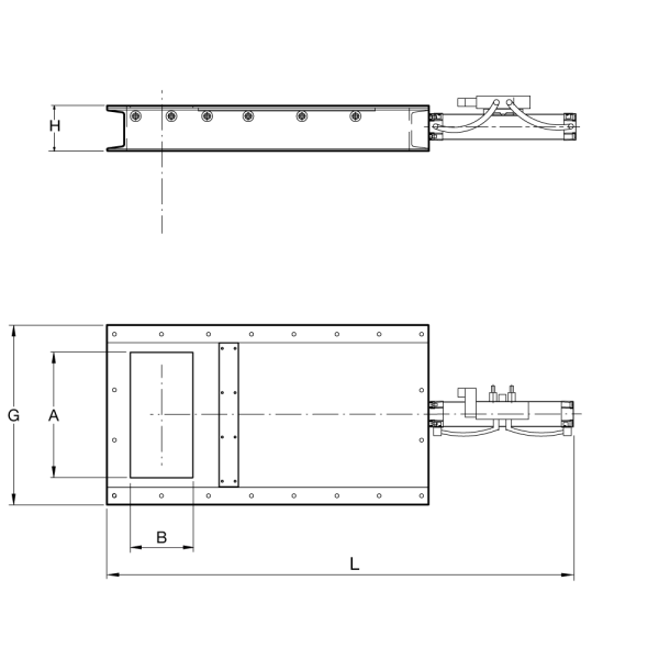 The outlet gate blade is secured in an open or closed position by means of the linear cylinder foreseen with limit switches and controlled by 5/2 monostable solenoid valve 24 V DC.