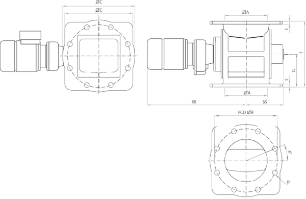 | Cast iron rotary valve RVD2-X3-08_Protectiv system according to ATEX 2014/34/EU norm, Group II. Category II1/- D Ex, Zone 20 inside/Safe area outside, with 8 adjustable blades in Polyuréthane, flameproof and explosion pressure shock resistant up to 2 bars with dust class ST2. Gear motor Nord 0,37 kW, 27 rpm. Inlet dimensions: 250x250. RAL 9006 | JCBA000002 |