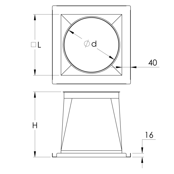 The transition pieces are produced from bent sheets spotwelded longitudinally. They are designed for a smooth transition between round and rectangular ducting elements for use in overpressure, under-pressure and pressureless systems.